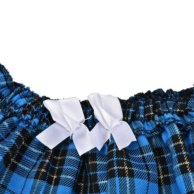 Miniskirt with blue plaid print and delicate bow tie in both left and right side.