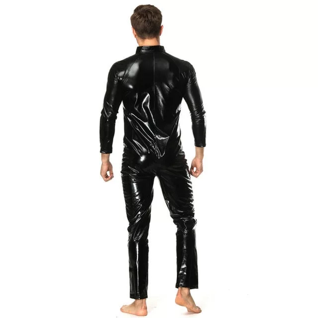 Wet Look 5XL Plus Size Hot Shapers Men Long Sleeve PU Leather Bodysuit Cosplay Jumpsuit Faux Latex PVC Catsuit Shiny Shapwear