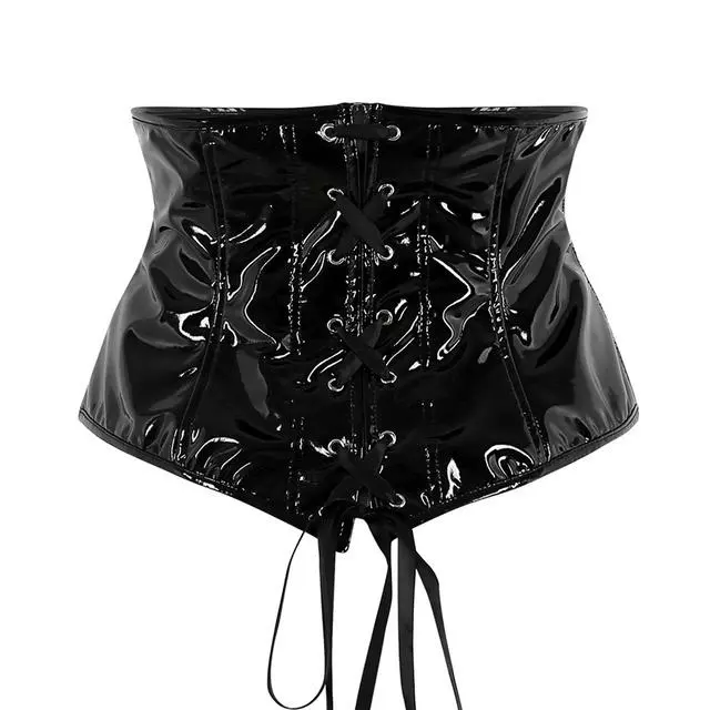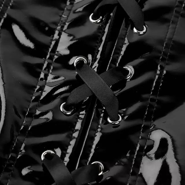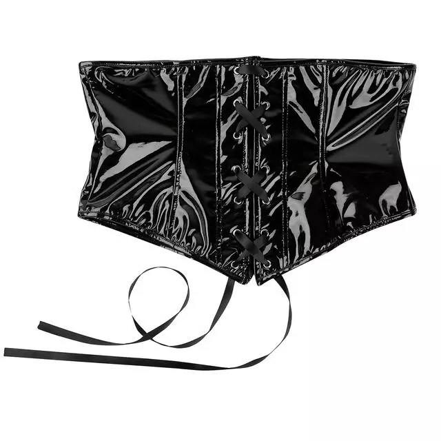 Womenรขโฌโขs under bust waist training corset, wet look leather fabric.