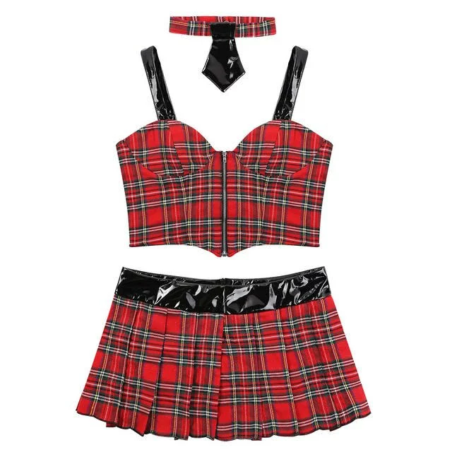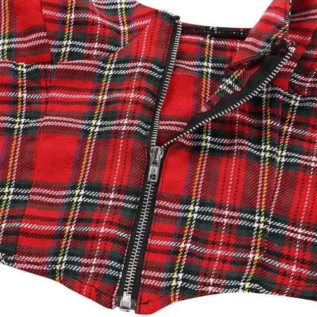Sleeveless, patent leather shoulder straps beautify you bust line, plaid crop tops with front zipper closure. Paired with a necktie.
